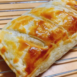 解凍したパイシート1枚を半分に切り、下部のパイシートに具をのせ、周囲に卵液を塗る。 上部のパイシートに切れ込みを入れてかぶせ、縁をフォークの背で押さえてから卵液を塗る。 0℃のオーブンで焼き始め、焼き色がついてきたら180℃に下げ、全体で~25分焼く。 サクサクのパイ生地でジューシーなミートソースを包みました。